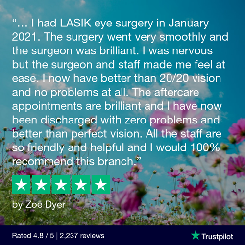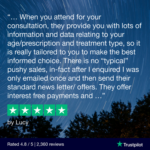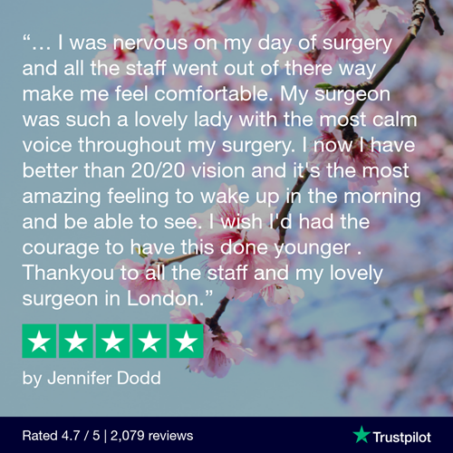 Whether you’re considering having laser eye surgery, lens replacement treatment or cataract surgery, you’re sure to find the information you need from over 2,000 reviews on our Trustpilot page. We like our patients to be as informed as they can possibly be before having their treatment with us, and a large part of that is hearing first-hand from other patients what to expect.