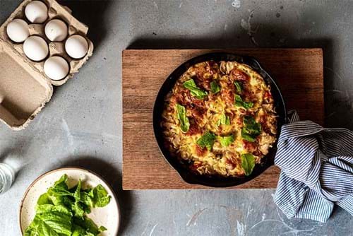 - Crack the eggs into a jug or a bowl, add a pinch of salt and pepper and whisk together. Turn the heat down to low/medium and pour in the egg. Cook the base of the frittata for about 5 minutes. Then transfer to the oven and cook for a further 15 minutes or until golden brown on top.